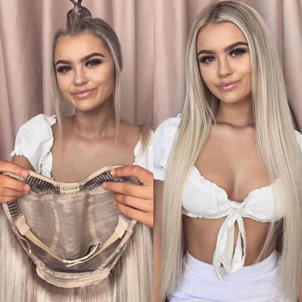 A Sienna é a fusão perfeita entre praticidade e luxo. Produzida em 100% cabelo humano virgem europeu Remy, apresenta fios lisos, sedosos e de brilho elegante, com o tom Ombre Icy Blonde — um loiro gelado com degradê sofisticado que ilumina o visual com modernidade e suavidade.